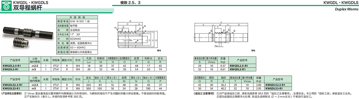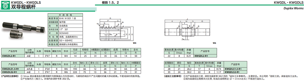 在小型機(jī)構(gòu)中要想實(shí)現(xiàn)高減速比及高轉(zhuǎn)矩,最簡(jiǎn)單的方法就是使用蝸輪系統(tǒng)。KHK 的標(biāo)準(zhǔn)蝸桿蝸輪產(chǎn)品,模數(shù)從0.5 ~6,減速比1/10~1/20,備有各種材料及形狀。另外,齒隙量非常小及可以獲得高精度旋轉(zhuǎn)的雙導(dǎo)程蝸桿蝸輪也列入了標(biāo)準(zhǔn)產(chǎn)品的行列中,敬請(qǐng)選用。各種 KHK標(biāo)準(zhǔn)蝸桿蝸輪的特長(zhǎng)列于下表。
