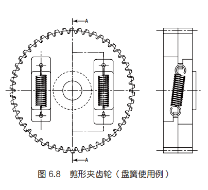 將分為兩半的齒輪利用彈簧等外力與另一個齒輪的輪齒夾緊,以去除輪齒間側隙。圖6.8示意了其構造圖。